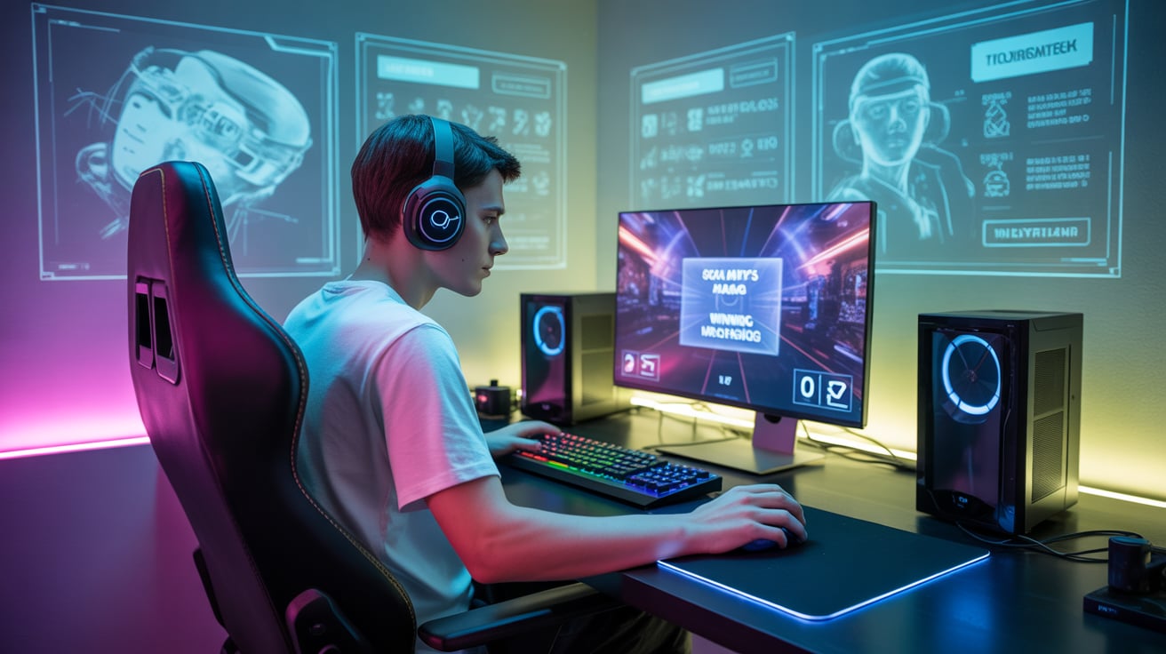 A highly skilled gamer analyzing gameplay patterns in real time, seated at a modern gaming setup with a large monitor displaying an in-game environment overlaid with glowing visual indicators such as enemy movement paths, attack timing arcs, cooldown cycles, and map flow patterns. Subtle holographic grids, arrows, and rhythm-like markers illustrate pattern recognition and strategic thinking rather than hacking. The atmosphere feels intelligent and focused, with soft neon accents, clean UI overlays, and a calm, controlled expression on the player’s face. Style is cinematic, semi-realistic digital art with sharp detail, cool lighting, and a sense of mastery, strategy, and mental precision.”